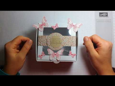Kennst du eigentlich die Donutschachtel von Stampin‘ Up! Diese Verpackung eigenet sich wunderbar zum Verschenken. Dort kannst du ganz einfach zu Anlässen wie Geburtstag, Hochzeit, Weihnachten oder einfach so eine Kleinigkeit verschenken. Nur noch kurz etwas gestalten und schon fertig. Hier mal eine Idee von mir. Ich wollte dabei unbedingt etwas mit der tollen neuen Schmetterlingsstanze von Stampin‘ Up! ausprobieren.